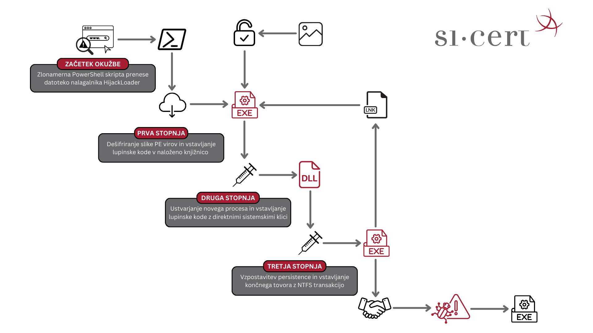Potek tristopnejske okužbe z zlonamerno kodo.